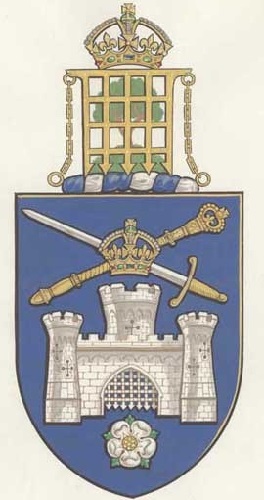 Registration: Volume 3 Registration 7, Registered 27 November 2019 Arms: A triple-towered castle between in chief a Sword of Justice point upwards to the sinister surmounted by a Parliamentary Mace head upwards to the dexter in saltire charged at their point of intersection with a representation of the Imperial Crown and in base a rose barbed and seeded (being the badge of York); Crest: In front of a Gum tree issuant from a Mount, a Portcullis ensigned with the Imperial Crown; Supporters: On the dexter side a Swan Sable beaked Gules and on the sinister side a White Swan proper Motto: Pro Rege Lege Et Grege ("For the King, the Law and the People"). Badge: N/A